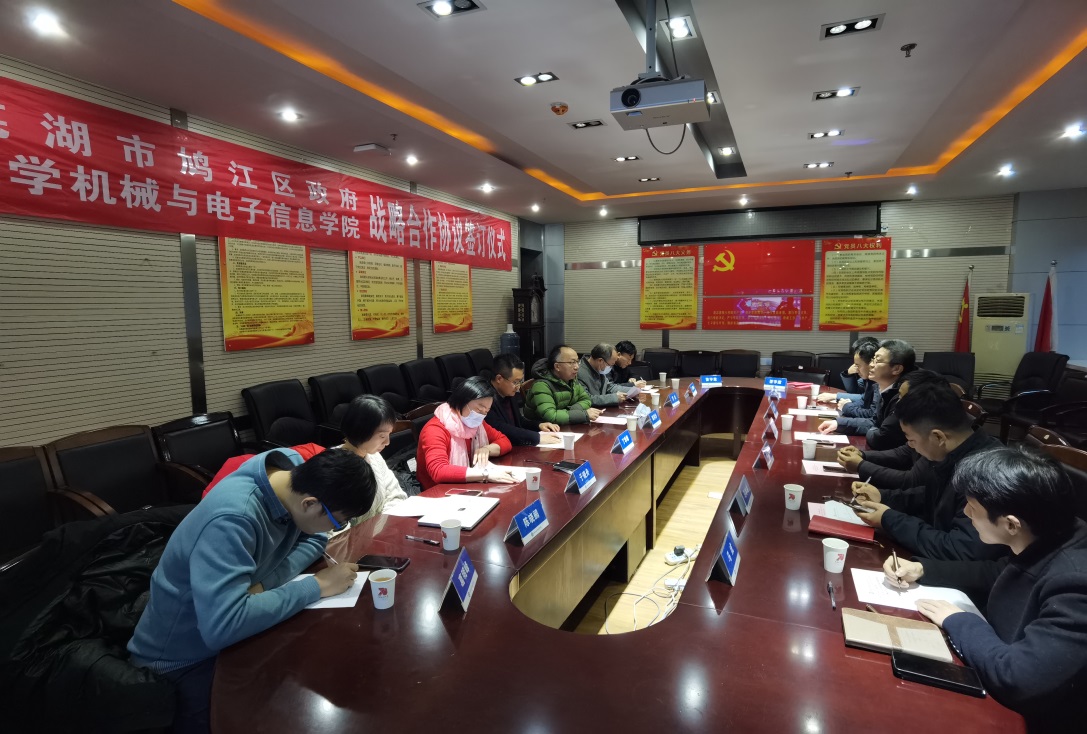 2022年01月12日下午,我院与芜湖市鸠江区人民政府代表在我校教二楼签订战略合作协议。机电学院党委书记瞿祥华、院长丁华锋等院班子成员及各系主任,鸠江区委组织部部长刘雪冬、鸠江区人社局局长肖宗明、鸠江区投资促进中心主任裴捷鸣、鸠江区委党校副校长马冰冰、鸠江区建投公司副总经理王孝国、鸠江区投资促进中心科员马成等出席签订仪式。会议由瞿祥华同志主持,丁华锋代表学院致欢迎辞。刘雪冬同志代表鸠江区人民政府表达与我院开展深入合作发展的热切愿望。此次会议是在2022年01月11日瞿祥华同志带队调研鸠江区返校后第二天举行。